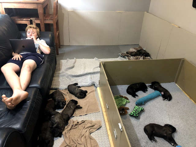 At 21 days of age the puppies are ready for more space and want out of their box! It’s like clockwork with these puppies. So at 3 weeks of age, Pixie’s puppies moved into the puppy room where they can move around more. The box is still in the room for a few more days so they can sleep in their at night and the couch will stay for a few more days too until they need more room to romp around! The puppies are doing great and are getting so cute. They can see and hear well now and are learning to move and play. They are also getting good at giving kisses.